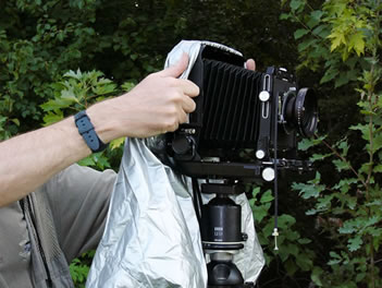 Drape the back edge of the BLACKJACKET™ focusing cloth's collar on the top edge of the camera back and slide your fingers down between the collar and the camera sides, drawing the collar around the camera back. |