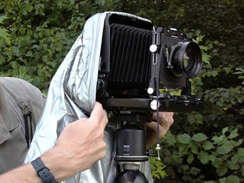 Stretch the BLACKJACKET™ focusing cloth's collar to fit around the bottom of the camera back. With the shock cord slack, the collar should actually fit loosely around the camera back. |