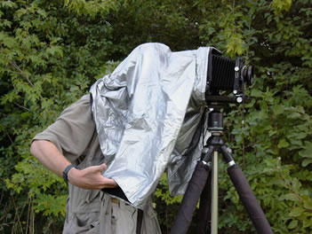 You should find it easy to locate the BLACKJACKET™'s sleeve cuffs with your hands without taking your head out of the darkened environment. When you do, slide your hands into the sleeves of the focusing cloth--from the outside. You'll discover that the loose folds in the fabric preserve the darkened environment whether your arms are in the sleeves or not. No more annoying light leaks to make focusing difficult! |